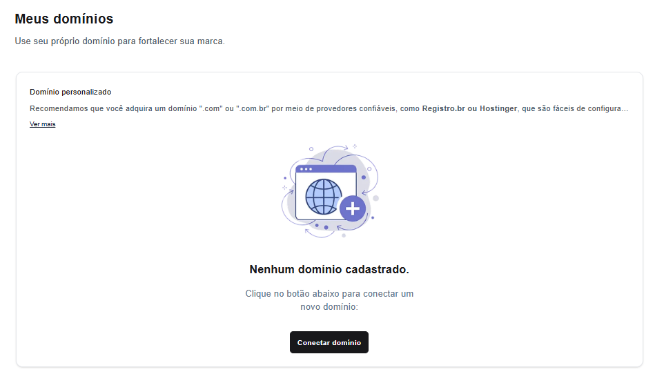 Além disso, é de extrema importância que você adquira apenas domínios com os sufixos ".com" ou ".com.br", de modo a evitar conflitos na integração. Se for seu primeiro acesso para configurar seu domínio, acesse este link e adquira um domínio desejado.