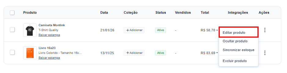 Escolha o Produto e clique nos 3 pontinhos, posteriormente em Editar Produtos