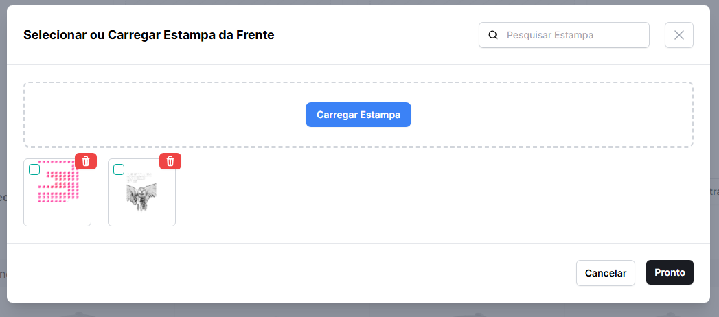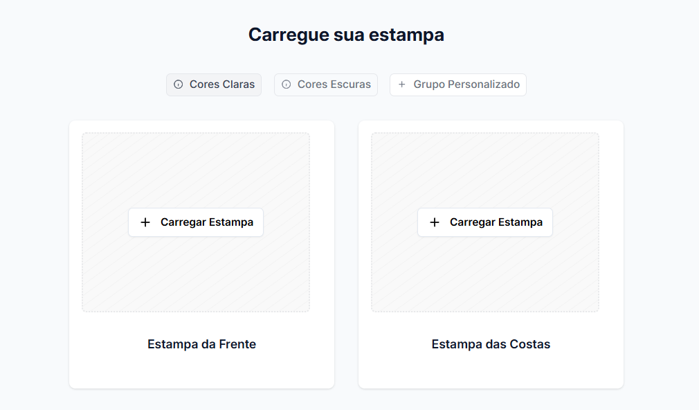 Ao clicar em “Carregar Estampa”, você será direcionado para a tela de upload das suas artes previamente criadas.