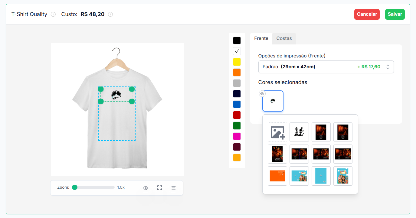 Além de subir estampas para frente e costas dos produtos, além de separar por cores claras e escuras. Basta clicar no Botão Avançados no canto superior direita da tela