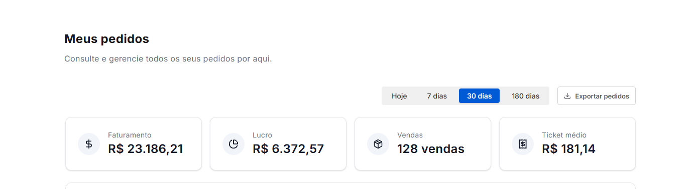 Adicionamos um filtro rápido de período e cards com métricas relevantes para o dia a dia do lojista.