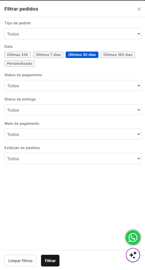 Filtros Avançados na LateralAo clicar em “Filtrar”, será exibido um menu lateral com diversas opções de filtros.