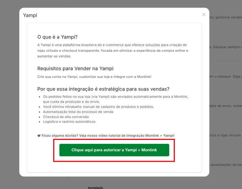 Um pop-up será exibido. Clique em Clique aqui para autorizar Yampi + Montink.