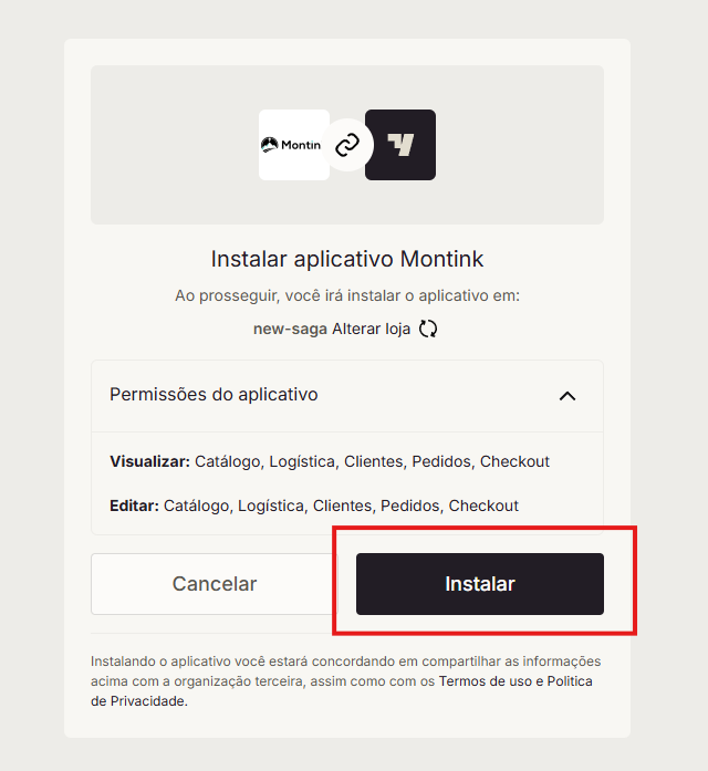 ⚠ Atenção: se você tiver mais de uma loja cadastrada, confirme que está conectando a loja correta. Para mudar, clique em Alterar Loja.🎉 Pronto! A integração foi concluída com sucesso.