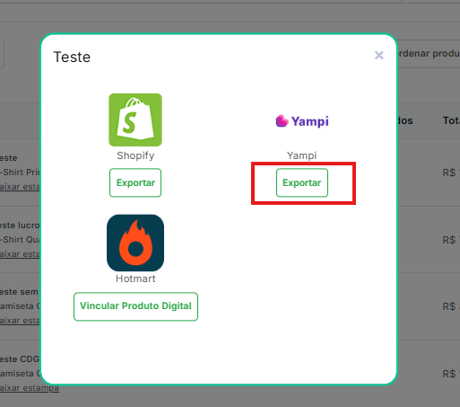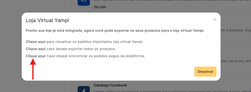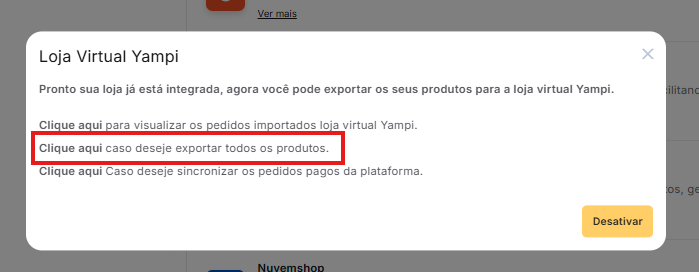 Ao lado do produto, clique no ícone da Yampi em Integrações.