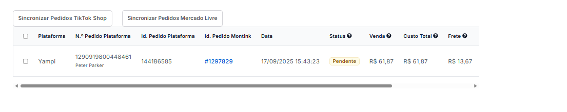 3. Após isso, com a integração com a Yampi funcionando normalmente, o pedido será enviado automaticamente para a sua conta na Montink, na seção Pedidos - Pedidos Externos