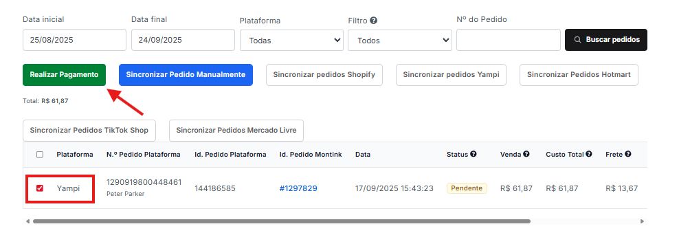 6. Para o pedido ser produzido, Marque o pedido e clique em Realizar Pagamento