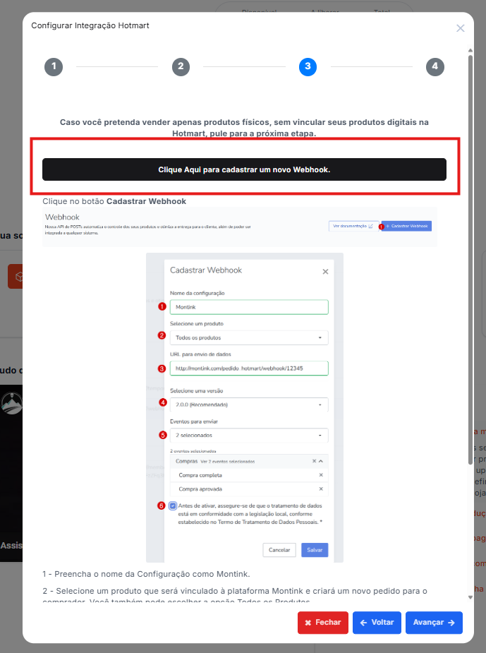 URL: copie o endereço indicado na dashboard da Montink e cole no campo de URL da Hotmart