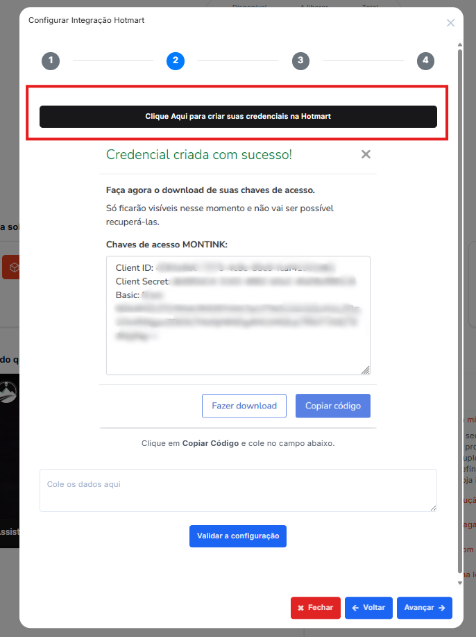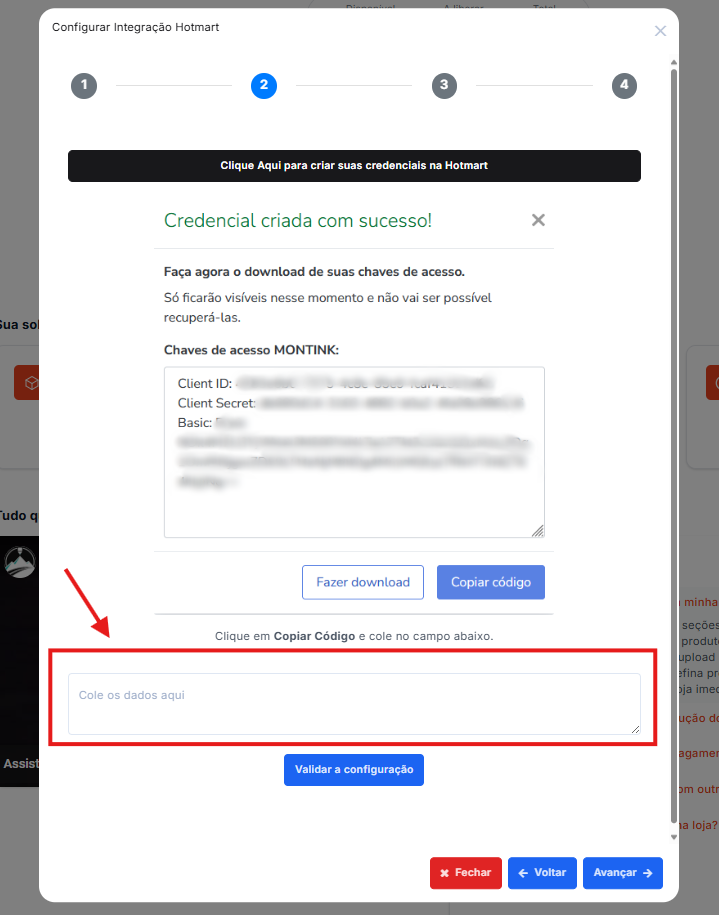 4. Cole os dados na dashboard da Montink e clique em validar configuração.