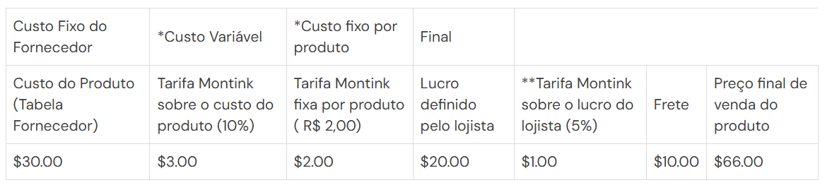 Pedidos realizados na plataforma Montink: Custo do produto (Custo fixo do fornecedor + Custo variável de 10% + Custo fixo por produto de R$ 2,00) + 5% sobre o lucro do lojista.