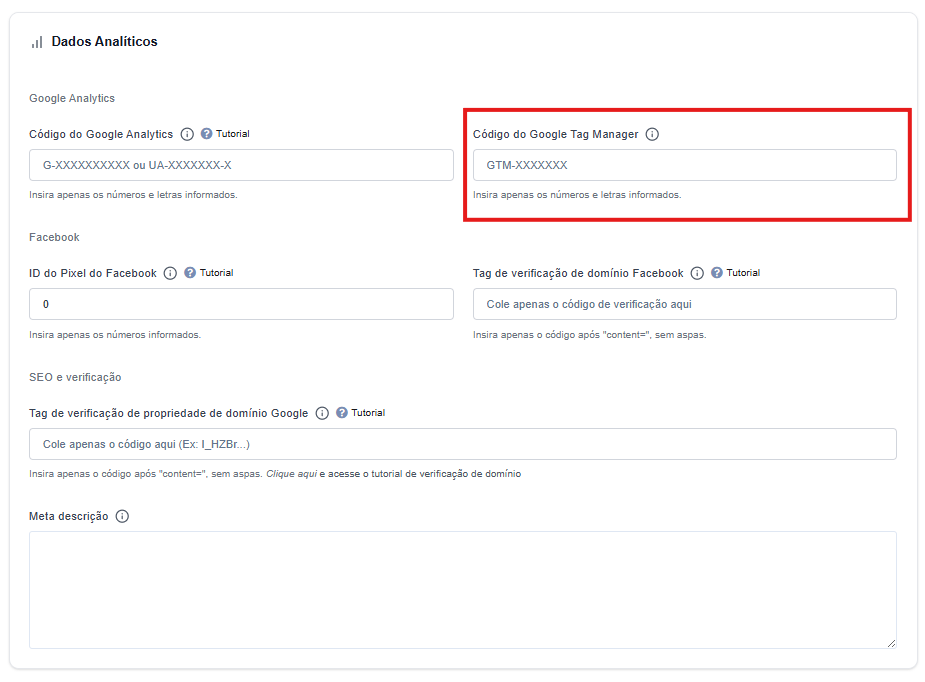 Cole o código do GTM no campo indicado