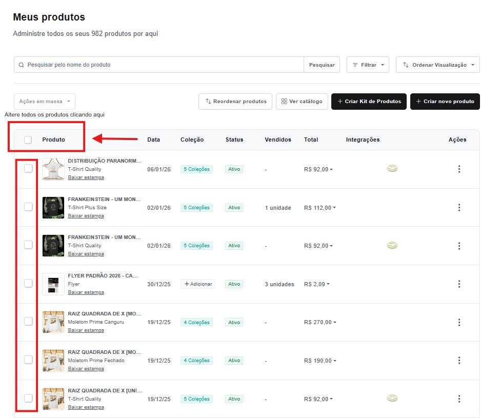 Nessa tela, você verá todos os produtos criados na sua loja e poderá selecionar quais deseja editar.