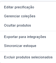Em alguns momentos, é necessário realizar alterações em massa, como ajustar valores, gerenciar coleções ou ocultar produtos.
