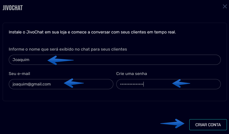 2. Na sequência, preencha os campos com o nome que será exibido no chat para seus clientes, seu e-mail da Jivo e sua senha de acesso da sua conta da Jivo.